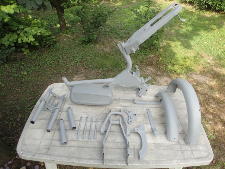 Miután nagyjából összeállt, természetesen szerettem volna egy új fényezést is, amit szintén saját magam munkájának terveztem. Jöhetett a kromofág, a rozsdátlanítás és a szórógitt. Közben teltek-múltak a hetek, de a látvány magáért beszélt: