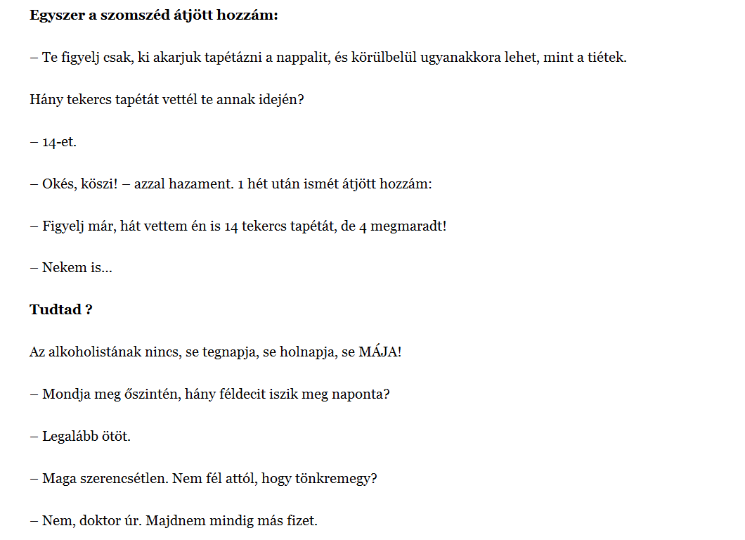 Gondolom,hogy ezen a szép tavaszi,Pünkösdi napon nincs különösebb okunk a szomorúságra,-hogy még vidámabb legyen ez a nap,egy pár viccszerűség: