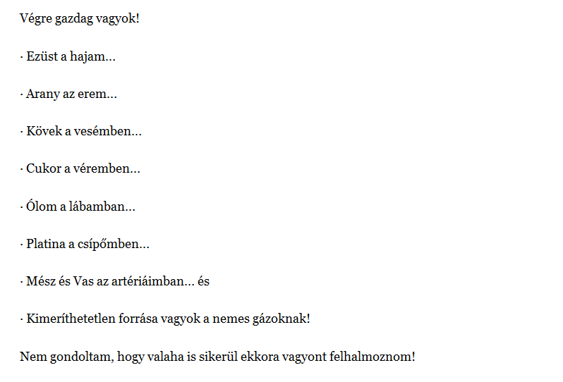 Zajlik tovább az este, mikor hősünk kényszert érez, hogy könnyítsen magán. Föláll, kimegy a Wc-re. Pár perc múlva visszatér, de a többiek megrökönyödve látják, hogy össze-vissza van hugyozva az öreg inge, nadrágja.