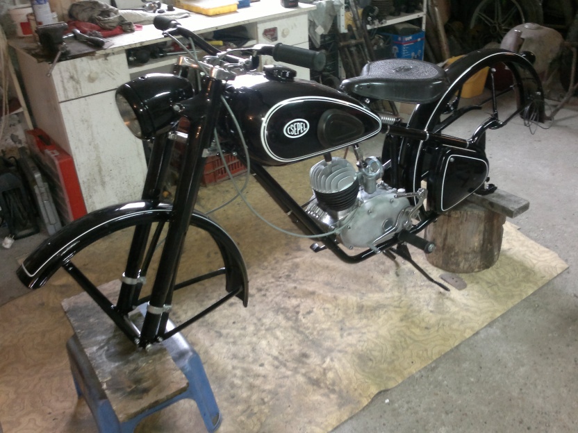 (Nemsokára elkészül a 250-es Csepelem, ami kb. 2-3 roncsból, meg egyenként vásárolt alkatrészekből lett összerakva, rémes állapotban volt némelyik, ezért muszáj volt a friss fényezés, frissen krómozott dolgok, utángyártott alkatrészek, stb...Örülök neki, szép-szép, de valahogy hiányzik belőle az a fíling, amit az eredeti festésű motorok árasztanak...)