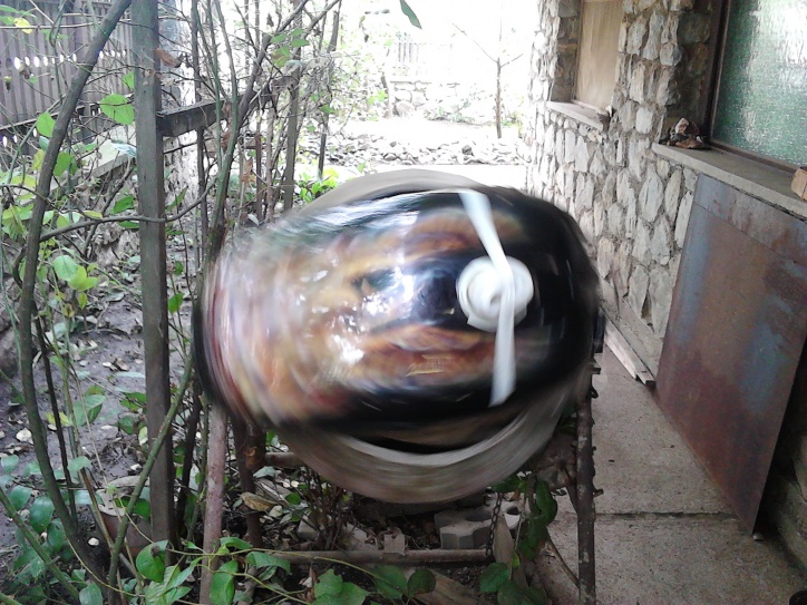A tankba összesen kb. 4 bő maréknyi szeget, u szeget, gipszkarton csavart tettem. Jó ideig szárazon forgattam, apránként változtatva a dőlésszöget, forgásirányt. A végén töltöttem bele benzint is, pár percig úgy is forgattam.