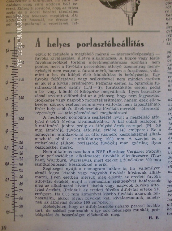 A szovjet motorok fúvókáit 1960-ig ccm/min. ben adták meg,akkor tértek át a fúvókák mm/100 értékre.Az AM 1962 nov-21. számában van egy nomogram 0,5mm-es fúvókától 1,5mm-es ig,illetve 40-től 400ccm/min átfolyásig.Ott a 182ccm/min átfolyáshoz 1,03(103)-fúvóka tartozik.A fúvókák átfolyását 1000mm benzinoszlop nyomásánál mérték. Ezt a módszert alkalmazták a csehszlovák porlasztóknál is.Az NDK BVF porlasztóira és a lengyel gyártmányokra nem volt érvényes ez a mérési mód,mert azokat 600mm benzinoszlop nyomásánál mérték.
